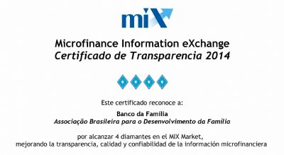 acaba de receber da organização norte-americana Microfinance Information Exchange (Mix Market) a certificação de transparência, qualidade e confiabilidade da informação do setor de microfinanças. O banco alcançou a avaliação quatro diamantes dos cinco possíveis conferidos pelo órgão.
