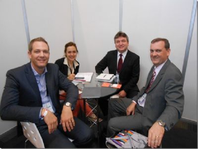 Novas negociações com instituições internacionais voltadas ao financiamento do microcrédito estão sendo alinhadas pelo Blusol após participação do presidente, Ido Steiner, e do diretor financeiro, Edilson Wilvert, no Foromic 2013. O evento é o maior fórum de microfinanças das Américas, e ocorreu na cidade de Guadalajara, no México, entre os dias 30 de setembro e 2 de outubro. Na foto aparecem Ido Steiner e Edilson Wilvert, com equipe da Triple Jump (instuição de funding – fundos para microcrédito).