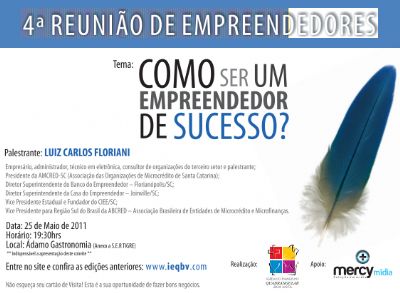 “Como ser um empreendedor de sucesso?”, é o tema da palestra ministrada pelo Presidente da AMCRED-SC, senhor Luiz Carlos Floriani, no 4ª Jantar dos Empreendedores da Igreja do Evangelho Quadrangular do Bairro Boa Vista, em Joinville. O evento será realizado na noite desta quarta-feira (25), às 19h30min, no Restaurante Ádamo, anexo á S.E.R. TIGRE. O investimento é de 30,00 R$ por pessoa, com direito a jantar e bebida.