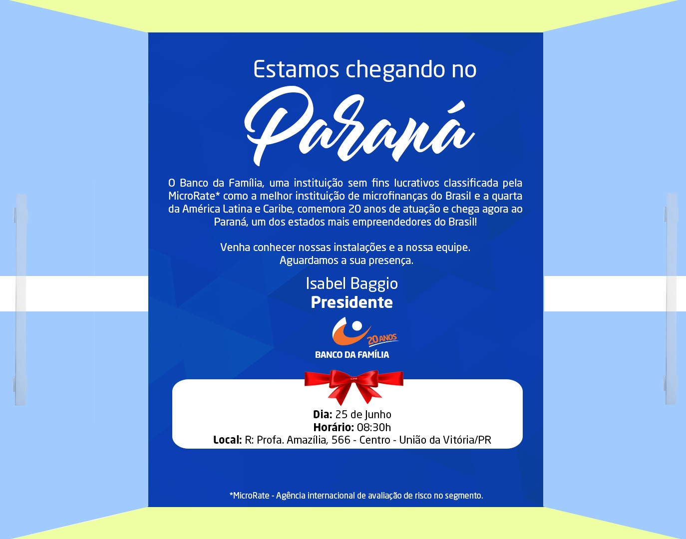 “Nossa chegada ao Paraná nos deixa mais próximos da meta, que é estar presente em todas as operações de microfinanças do Sul do Brasil”, diz Isabel Baggio, presidente da instituição. “União da Vitória é bastante estratégica, pois faz divisa com Santa Catarina e fica bastante próxima das nossas agências de Videira e Caçador, além de ser uma região que tem perfil para ser atendida pelo Banco da Família”.