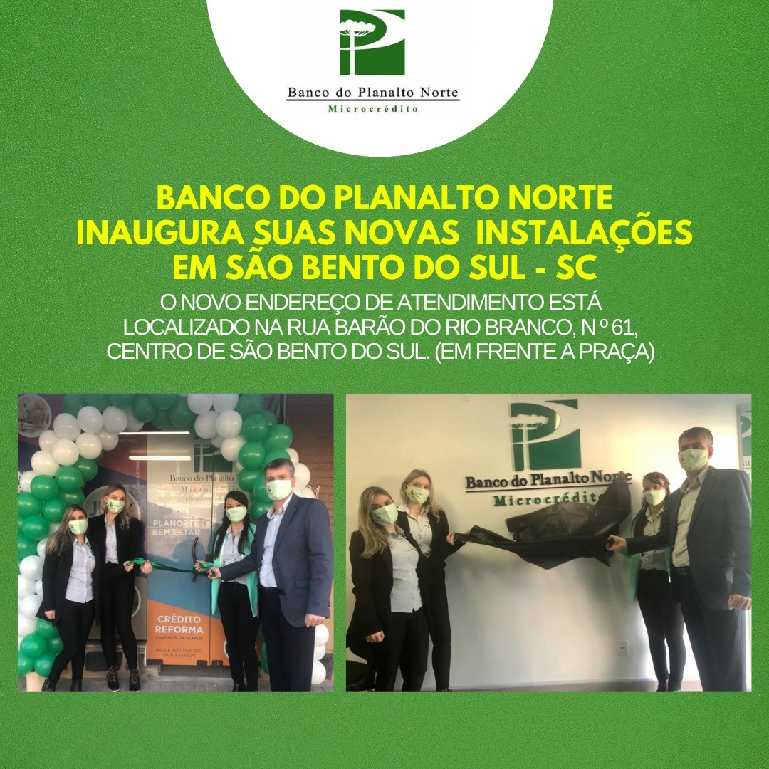 Em São Bento do Sul - SC, O BANCO DO PLANALTO NORTE inaugurou as novas instalações do posto avançado, nesta segunda feira, 10. O novo posto está localizado na área central do município, na RUA BARAO DO RIO BRANCO, 61 (Em frente à Praça Getúlio Vargas), permanecendo o mesmo telefone para contato (47) 3635-2045.