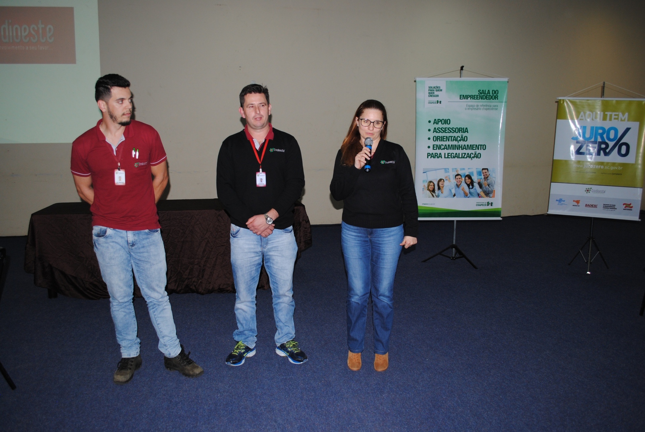 Em seguida, a gerente executiva da Credioeste Marcia Biffi demonstrou a história e o foco da instituição por meio da apresentação de um audiovisual institucional e falou sobre as modalidades de crédito destinadas aos microempreendedores individuais (MEIs) e aos profissionais autônomos. Também destacou que a agência de microcrédito está de portas abertas para esclarecer dúvidas e formalizar financiamentos visando fomentar os pequenos negócios, além de realçar que a metodologia de trabalho da instituição consiste em visitas dos agentes de crédito aos clientes para identificar as necessidades e orientar sobre a melhor forma de utilizar o crédito. Em seguida, os agentes de crédito Léo Paulo Martelli e Ederson Behne explicaram sobre a modalidade Juro Zero.
