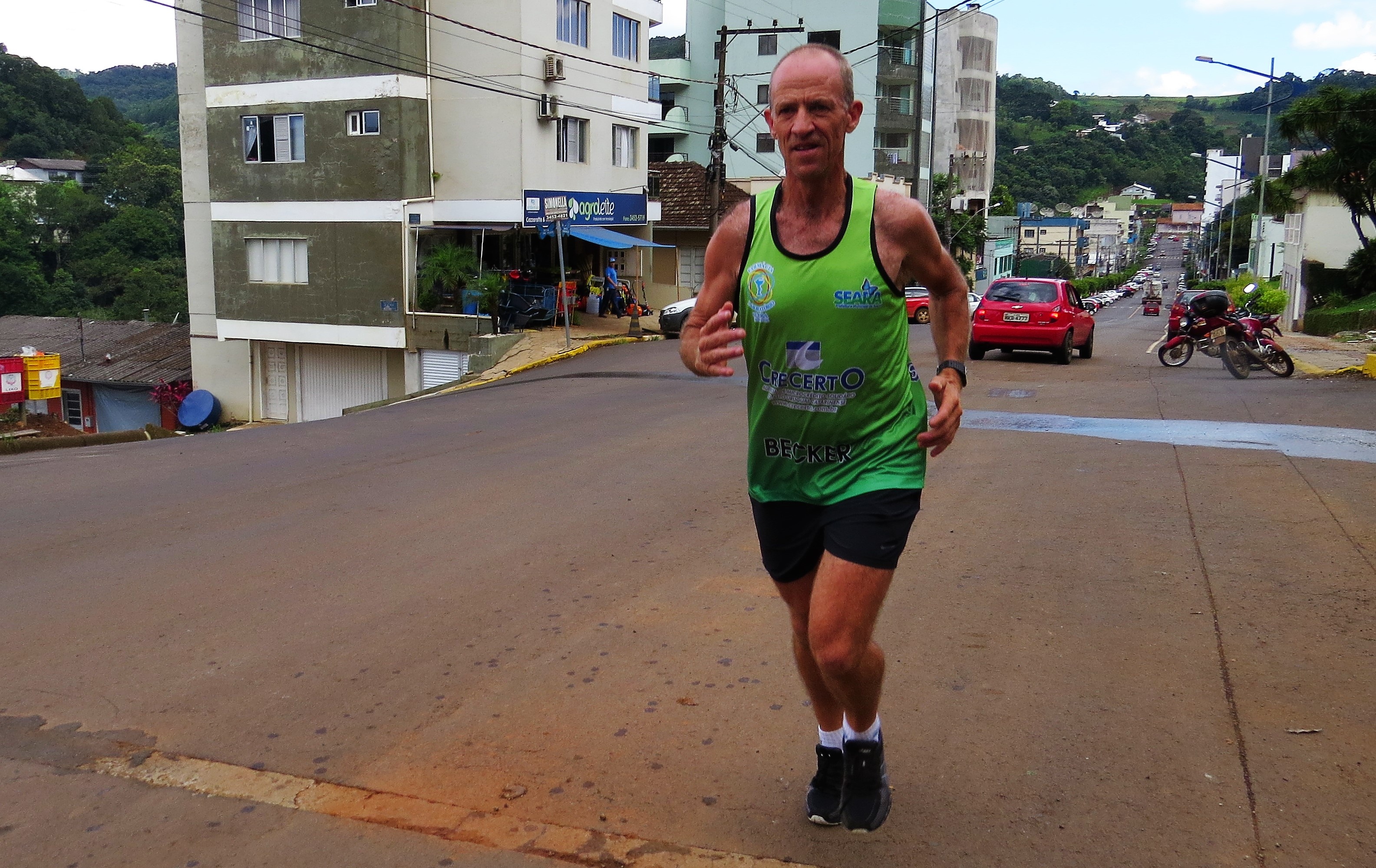 Neudi Becker roda pelo interior de Seara (SC) com seu Ford Fiesta azul levando no porta malas uma carga especial. Uma caixa de isopor carrega certa de 20 quilos de sorvete e picolé que ele vende para moradores de áreas rurais do município. Para manter os produtos bem gelados ele cobre tudo com gelo em gel rígido. “Saio todos os dias bem cedo e percorro cerca de 70 a 80 quilômetros, diariamente!”, estima ele. A vida agitada de Neudi continua no final do dia quando ele deixa o carro em casa e começa uma outra corrida. Diariamente, ele faz um treinamento de 20 quilômetros para manter a forma e poder participar de maratonas, esporte que pratica há quase quarenta anos. “Comecei a correr para manter a saúde em dia. Hoje, se eu deixar de correr uma semana, me faz falta. Tá no sangue. O dia que eu não puder correr, o mundo acaba pra mim”, brinca.