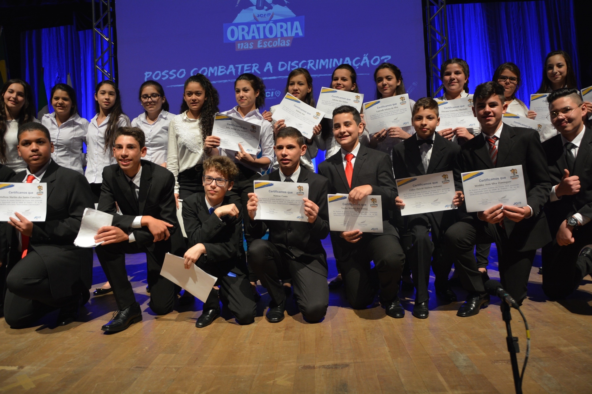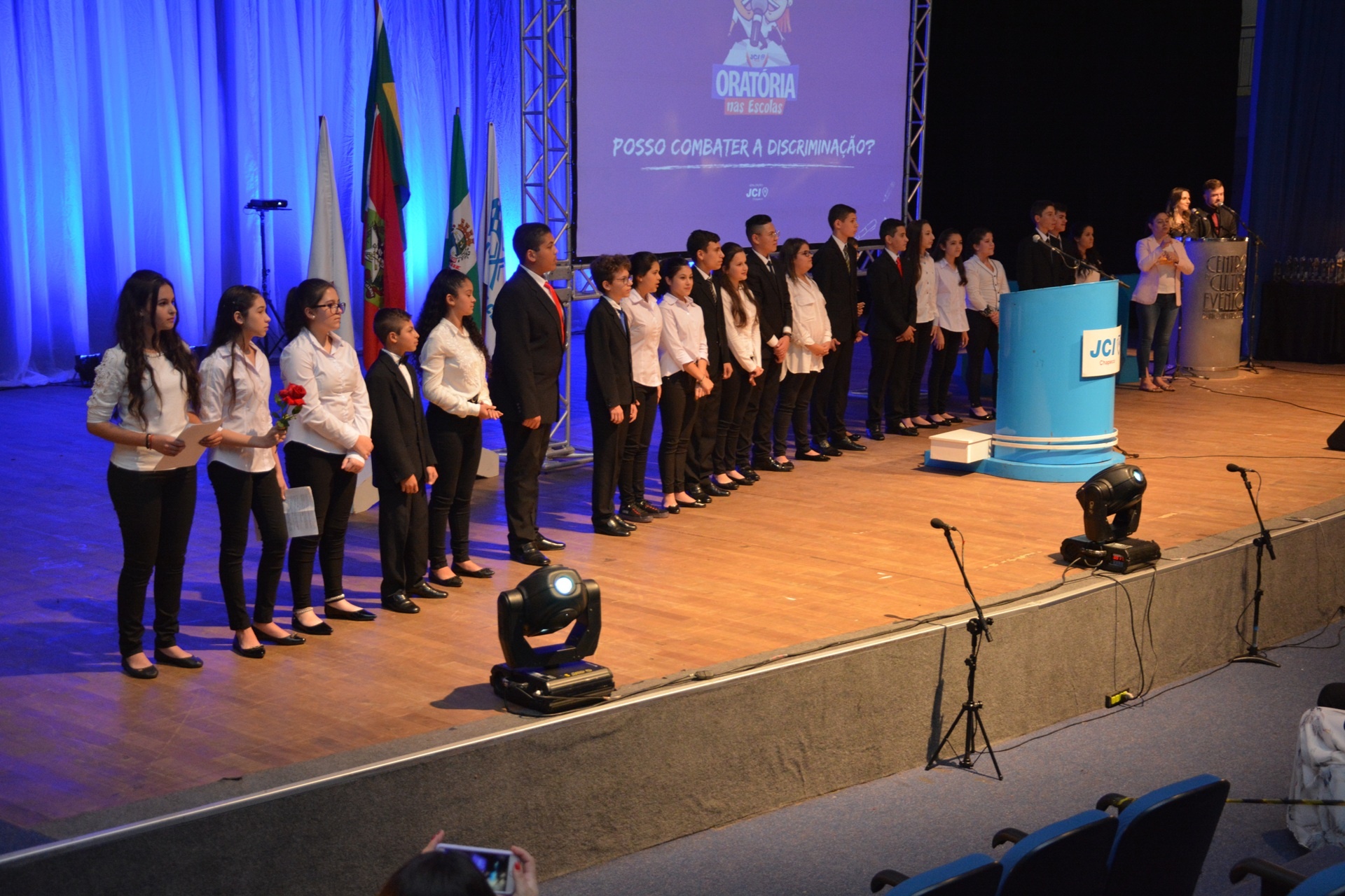 O projeto Oratória nas Escolas teve a sua emocionante final nesta quinta-feira (29), no Teatro do Centro de cultura e Eventos Plínio Arlindo de Nês, em Chapecó. A11ª edição do evento foi promovida pela Junior Chamber International (JCI) e pelo sétimo ano consecutivo contou com a parceria da Credioeste. Ao todo, 21 alunos comoveram um auditório lotado com discursos sobre o tema “Posso combater a discriminação?”.